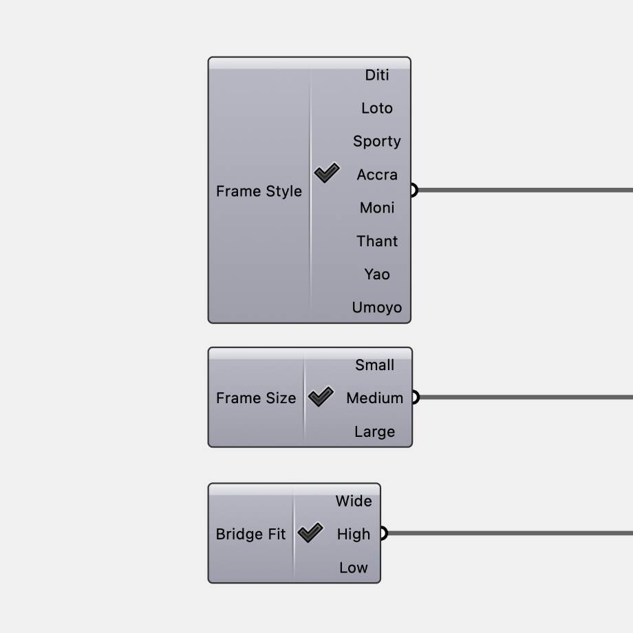 Once the fit categories are defined, they are translated into geometric rules that control the frame. These rules determine key aspects such as bridge shape, frame width, and the positioning of contact points.