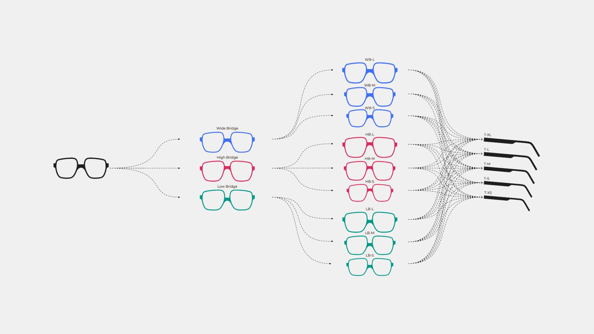 The system defines three primary nose bridge profiles -Low Bridge, Medium Bridge, and High Bridge -combined with multiple frame widths and temple lengths.